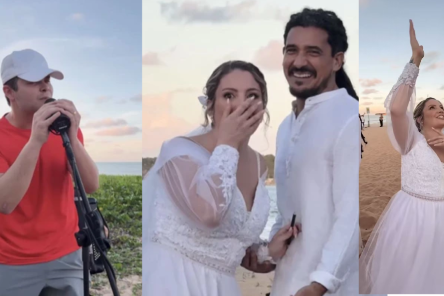Um casal teve uma surpresa incrível durante o casamento nesta quinta-feira (12). O cantor Matheus, da dupla Matheus & Kauan, passava de bicicleta pela praia de Cabo Branco, em João Pessoa, e resolveu parar para cantar para os noivos.